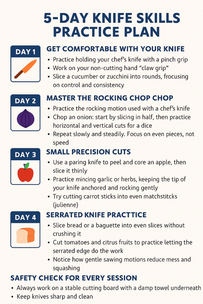 Practice at Home: Start small. Try chopping an onion, dicing a carrot, or mincing garlic, and repeat until it feels natural.