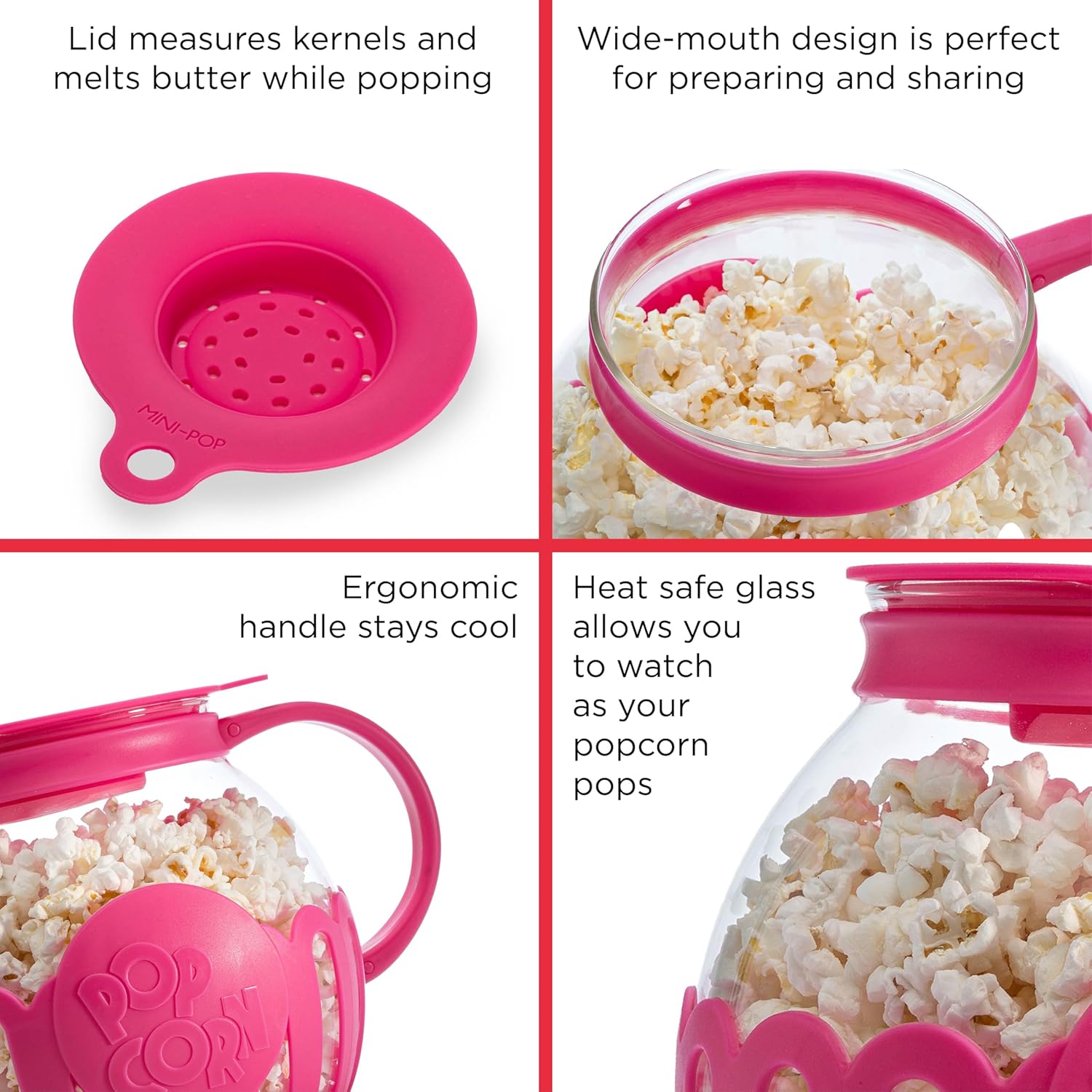 - WHY GLASS IS BETTER: Watch your popcorn popping for perfect results. Temperature-safe glass resists wear-and-tear and will not absorb acids or chemicals typically produced during use. Glass is made without BPA, hypoallergenic, and thermal shock resistant. Wide-mouth design and ergonomic handle add versatility and ease of use.
