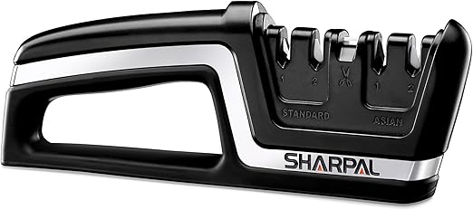 The SHARPAL 5-stage sharpener quickly restores dull knives and scissors with preset 15° and 20° angles for precise results. Built to last over 10,000 uses, it features coarse and fine sharpening notches plus a secure, rubberized handle for safe, comfortable operation.