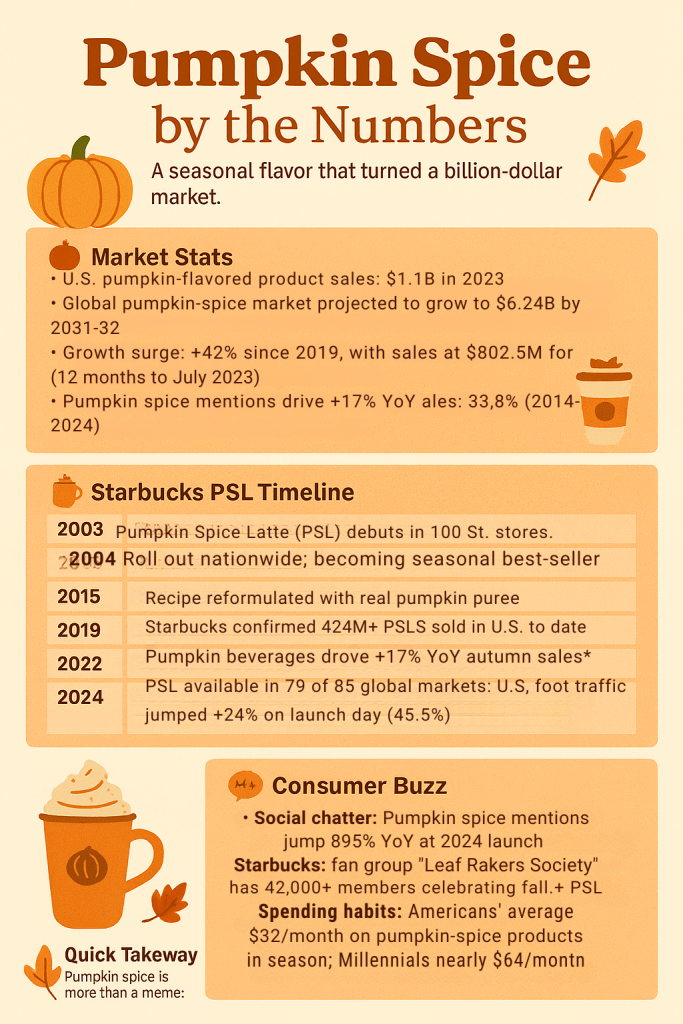 U.S. pumpkin-spice/pumpkin-flavored product sales topped $1.1 billion in 2023 and are projected to explode to $2.2 to $2.4 billion by 2031–2032.